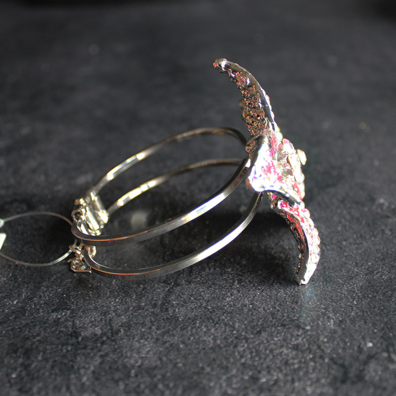 A metal hinged bangle featuring a large flower decorated with pink and clear crystals.