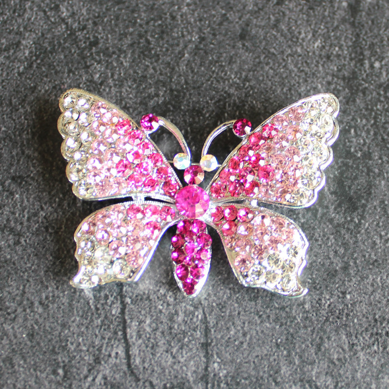 A sparkling butterfly brooch in shades of pink and clear diamante crystals.