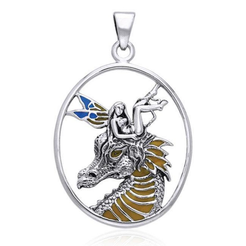 A beautiful sterling silver pendant with enamel highlights, featuring a fairy sitting on a dragon's head. Designed by Peter Stone.