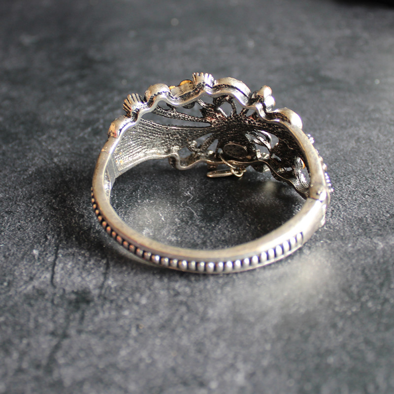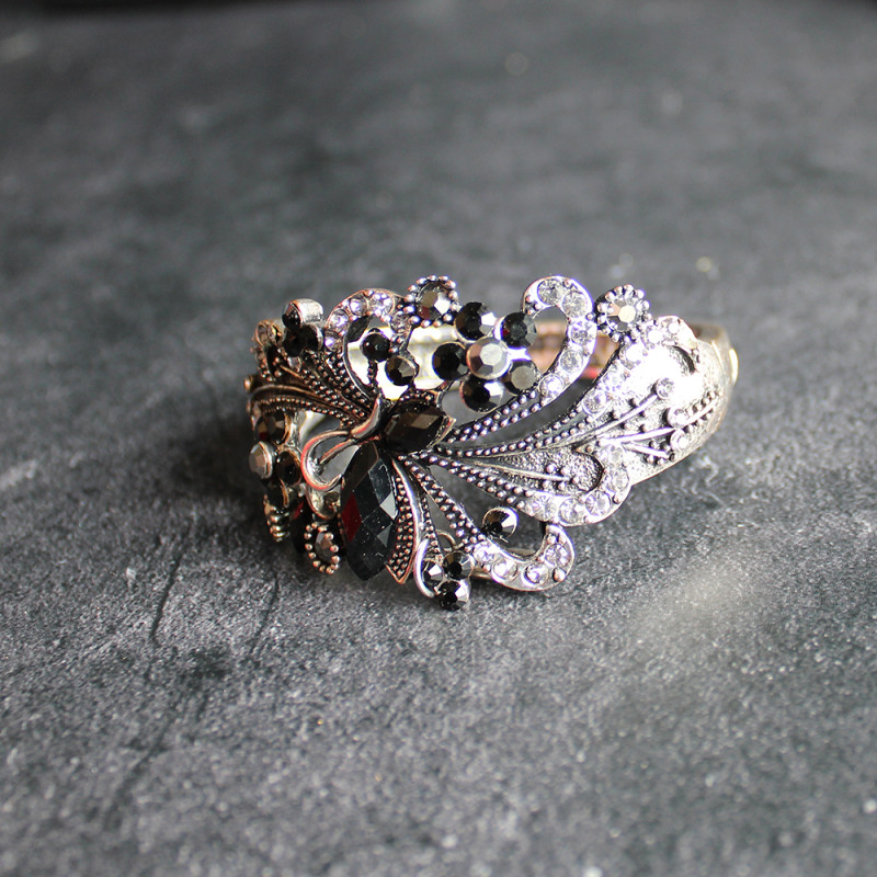 Adorn your wrist with this exquisite antique silver hinged bangle, beautifully decorated with black jewels arranged in an elegant flower design. A timeless piece that adds a touch of sophistication to any outfit.