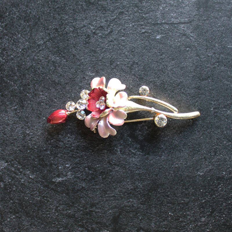 A beautiful flower brooch with a soft metallic pink sheen and highlighted with sparkling crystals.