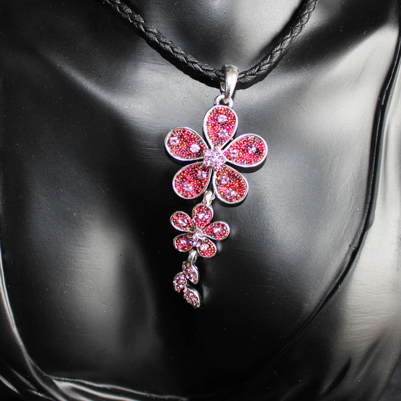A very pretty necklace comprising of a twisted cord necklace and a two flower and leaves pendant in red.