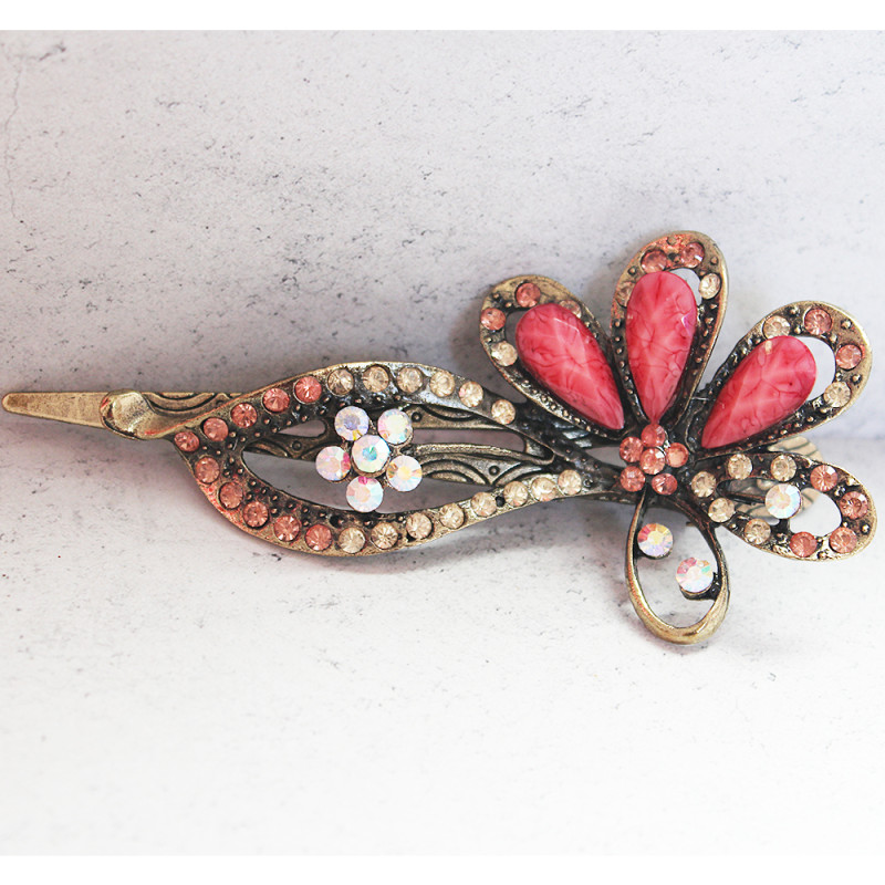 A large metal beak clip featuing a flower design in coral coloured gemstones and lighter pink and champagne coloured crystals.