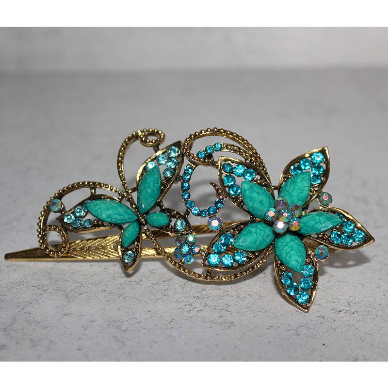 A large metal beak clip featuing a flower and butterfly design in teal coloured gemstones and lighter turquoise crystals.