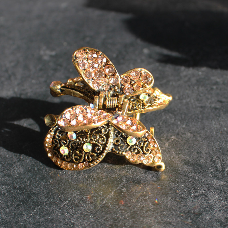 A brass metal hair clamp in the style of a double butterfly that is decorated with pink crystals.