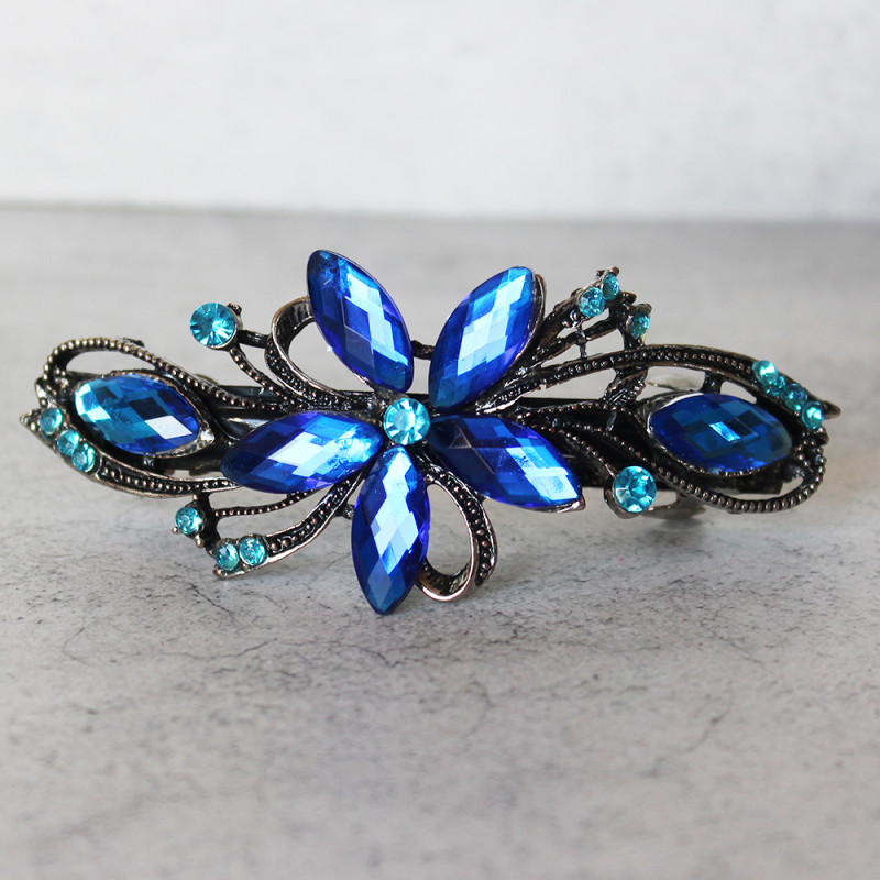 Adorn your hair with this exquisite green crystal hair clip, featuring a central flower design. Perfect for adding a touch of elegance and sparkle to your hairstyle.