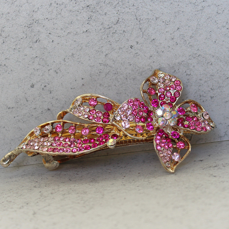 Adorn your hair with this exquisite pink crystal hair clip, featuring a central flower design. Perfect for adding a touch of elegance and sparkle to your hairstyle.