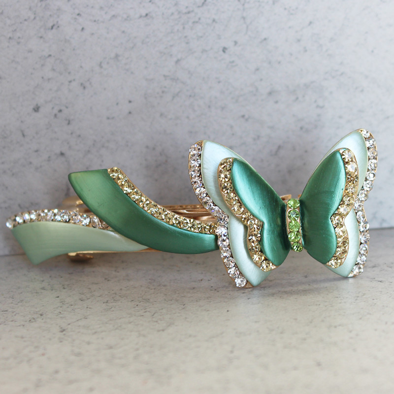 A beautiful hair clip with a double butterfly design in a soft sheen metallic green colour and decoratd with contrasting crystals.