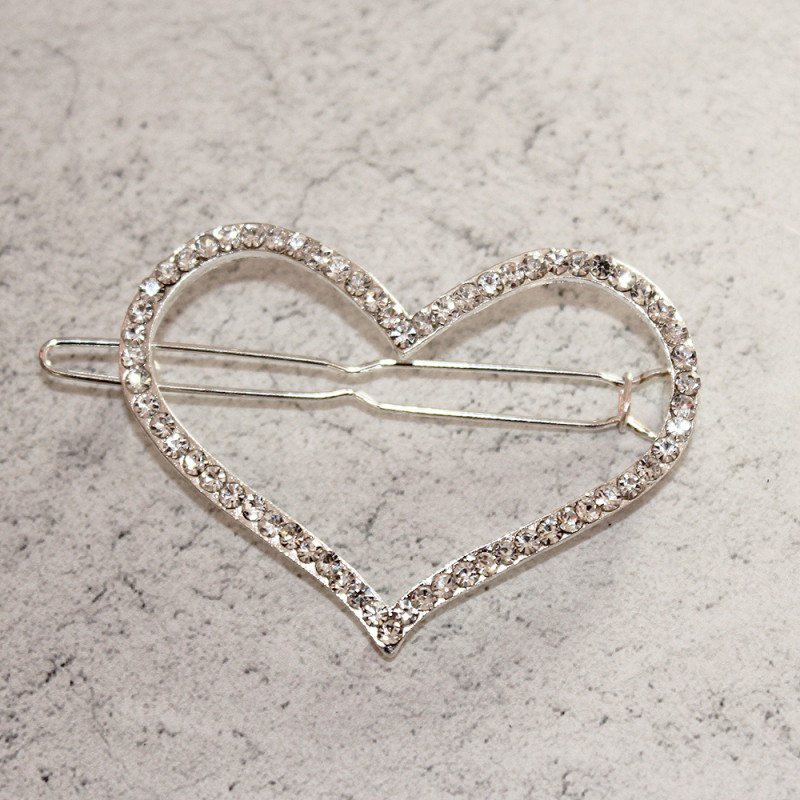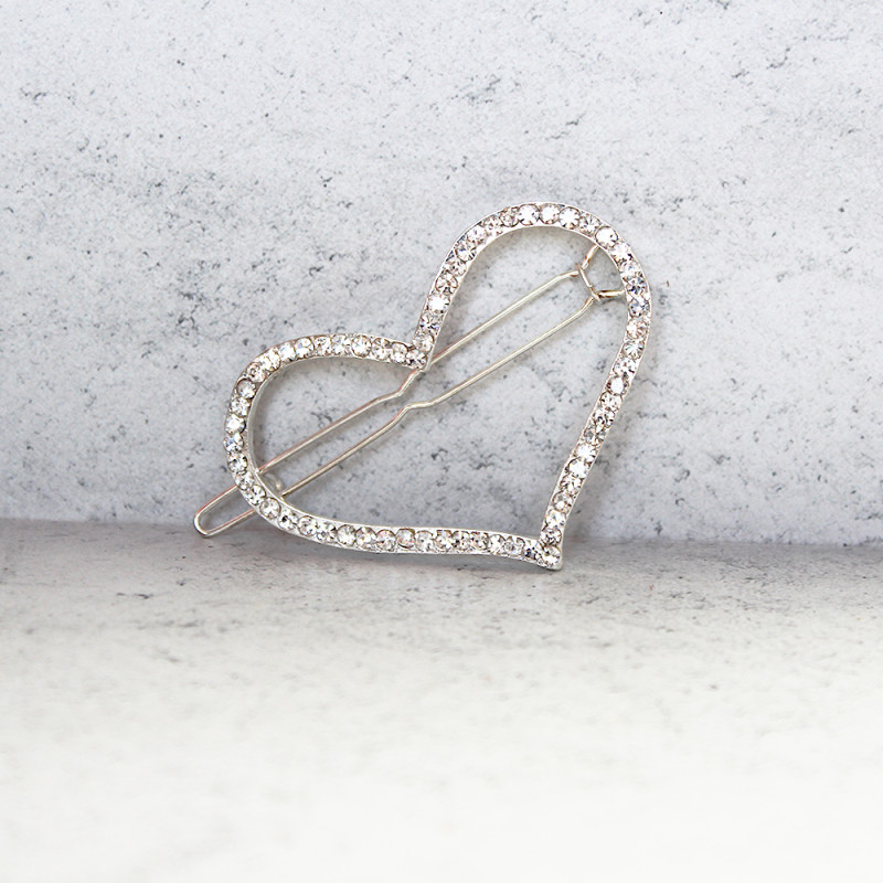 A large heart shaped hair clip in silver metal, studded with sparkling diamante gemstones.