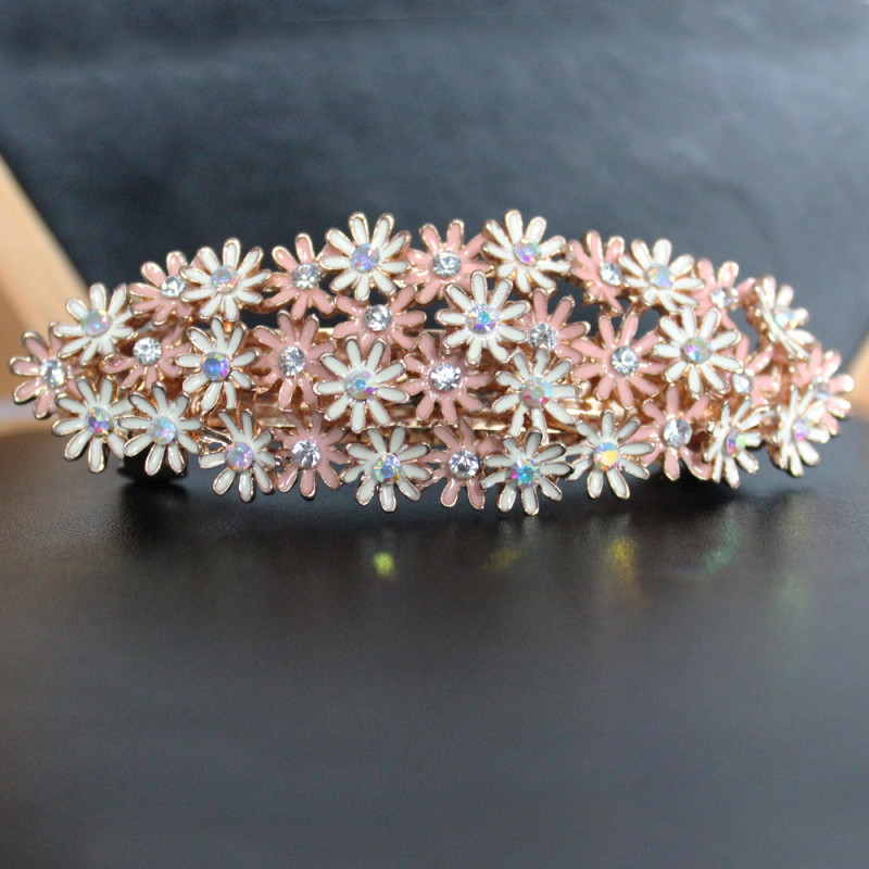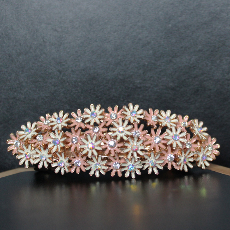 A large barrette style hair clip in an oval shape, decorated with small flowers in pink and white which have crystal centers.