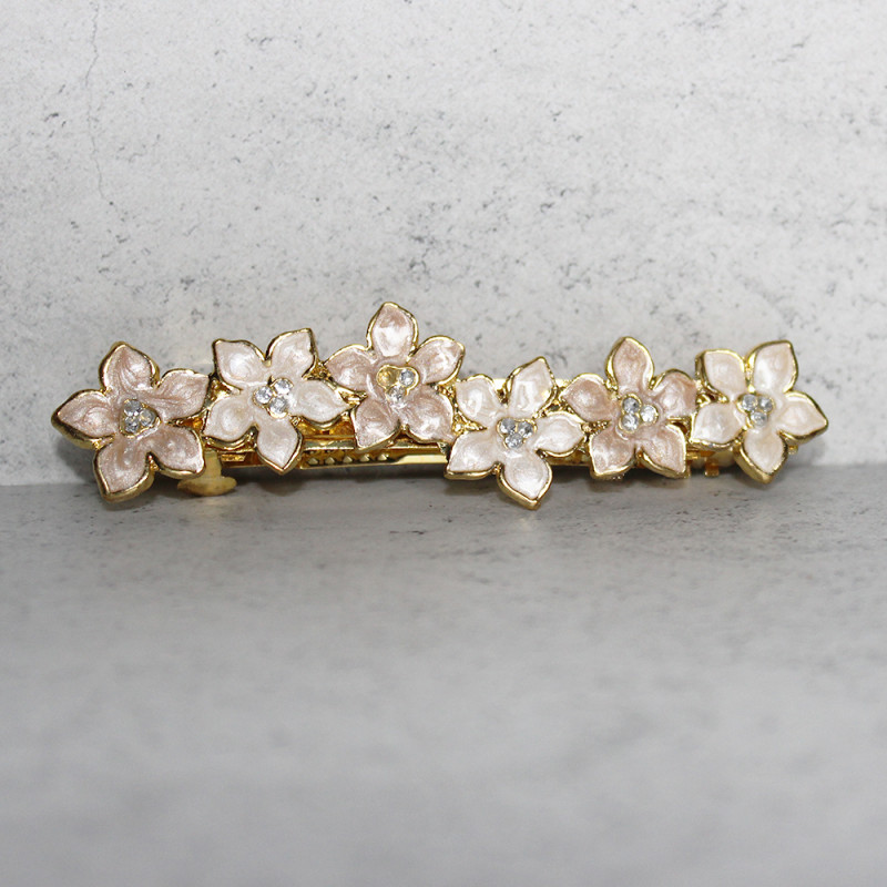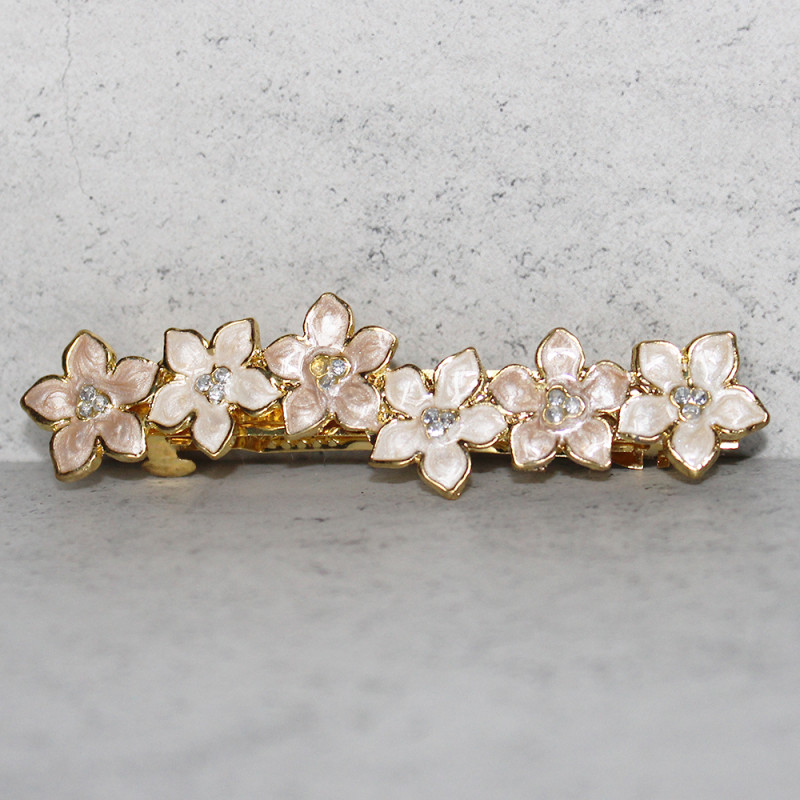 A pretty hairclip comprising a row of pearlised flowers with crystal centers.