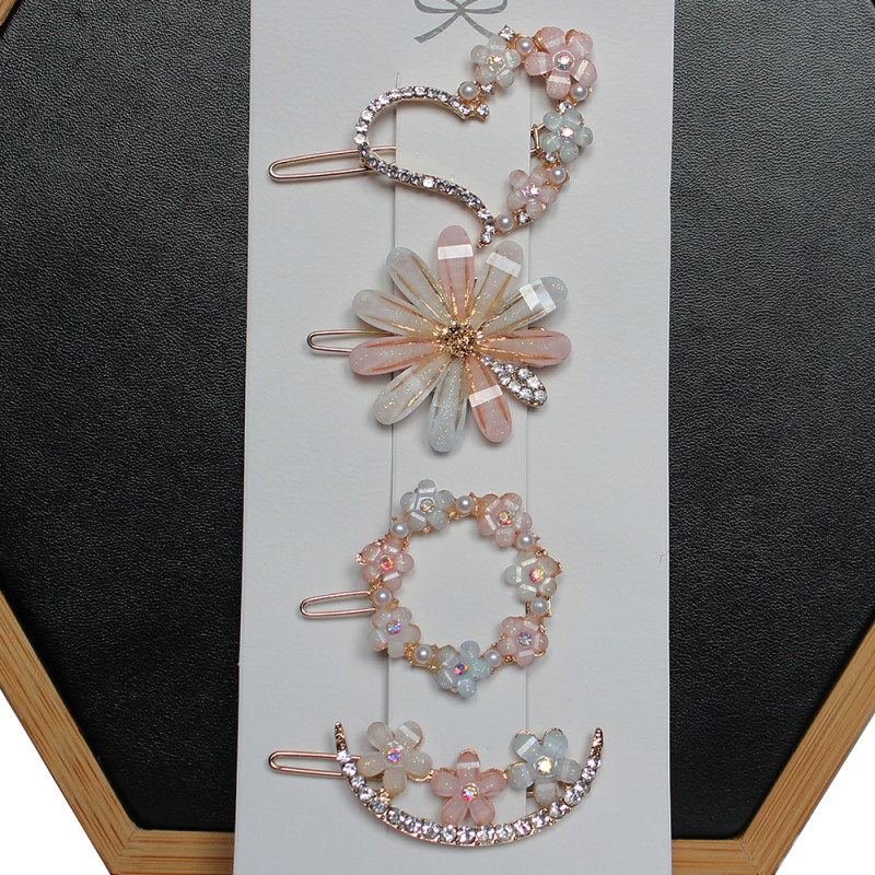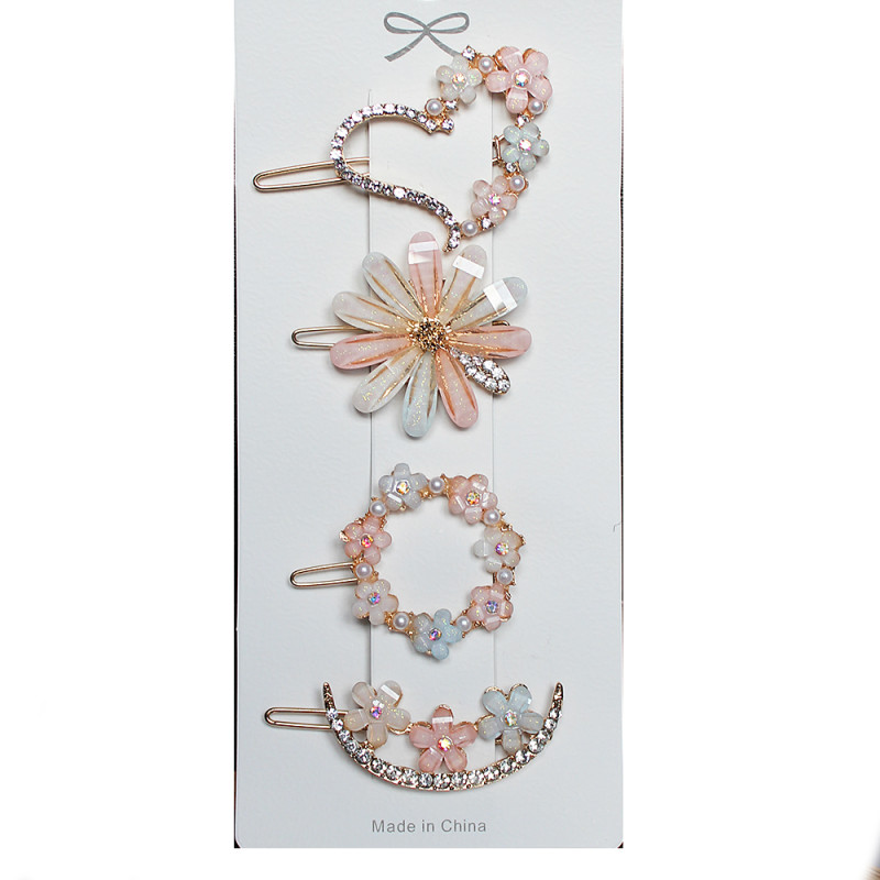 A beautiful set of four hair clips each featuring a pastel pink and blue design, highlighted with clear diamante crystals.