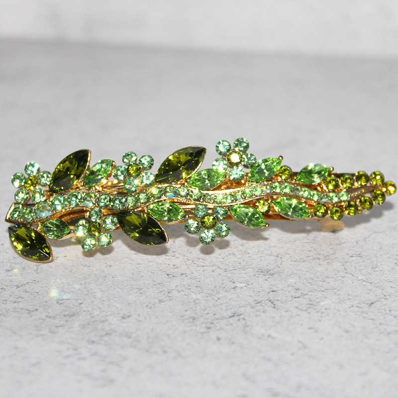 A beautuful large hair clip in a leaf shape and studded with green Swarovski crystals set on to a gold toned metal hair clip.