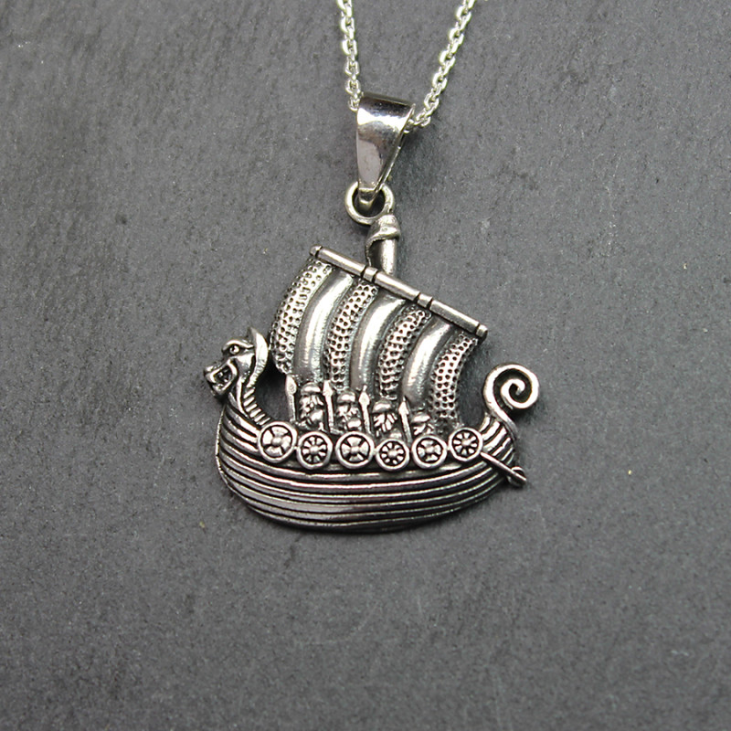 A highly detailed pendant in sterling silver of a Viking longboat, complete with dragon head prow, shields at the sides, and little Vikings sitting inside. This pendant is perfect for those who appreciate Viking craftsmanship and timeless jewellery.